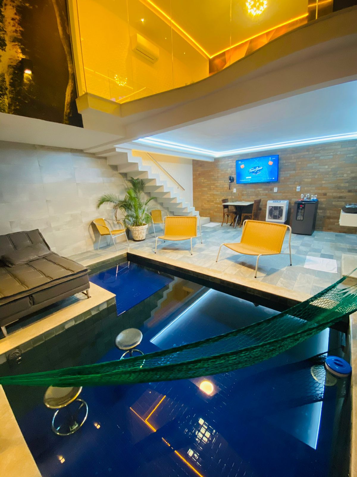 Piscina, banheira na área interna, tantra chair, e pole dance.